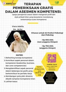 HIMPSI JAYA bersama Koperasi Harjaya Jiwangga Utama akan mengadakan pelatihan Terapan Pemeriksaan Grafis Dalam Asesmen Kompetensi, yang ditujukan bagi S2 Profesi Psikologi dan Psikolog, dan akan diadakan pada: